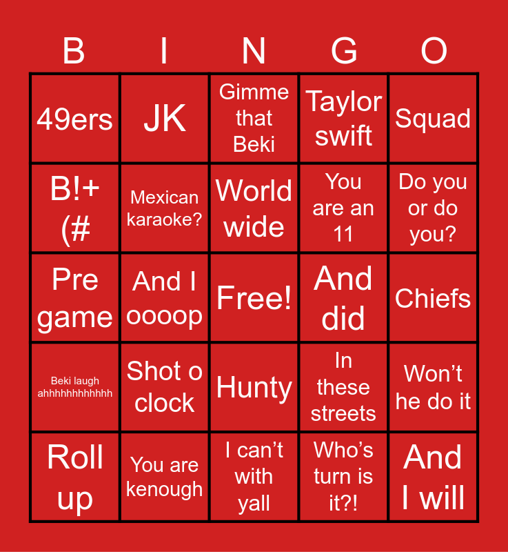 This bingo card has a free space and 24 words: Shot o clock, You are kenough, World wide, Roll up, Squad, 49ers, B!+(#, JK, And did, Hunty, You are an 11, Pre game, In these streets, Won’t he do it, Mexican karaoke?, Who’s turn is it?!, Chiefs, Gimme that Beki, Do you or do you?, And I oooop, And I will, Beki laugh ahhhhhhhhhhhh, Taylor swift and I can’t with yall.