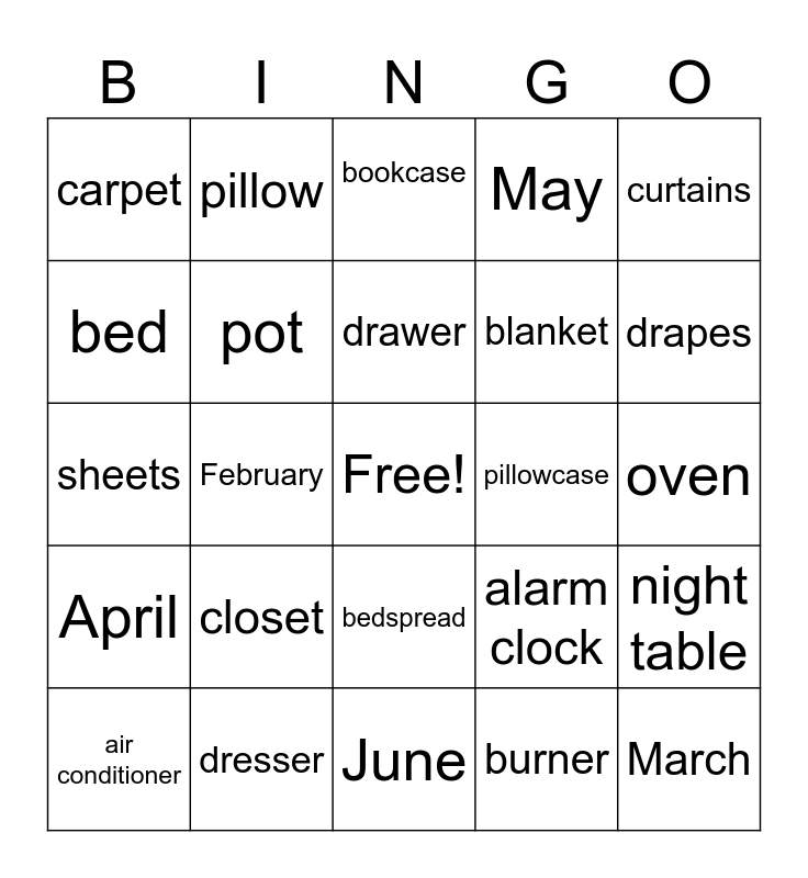 This bingo card has a free space and 24 words: closet, dresser, drawer, air conditioner, curtains, carpet, bed, pillow, pillowcase, bedspread, blanket, sheets, alarm clock, night table, pot, burner, oven, bookcase, drapes, February, March, April, May and June.
