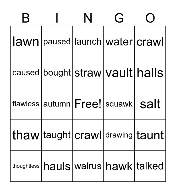 This bingo card has a free space and 24 words: taught, hauls, straw, thoughtless, crawl, lawn, caused, paused, squawk, crawl, vault, flawless, drawing, taunt, bought, hawk, salt, launch, halls, autumn, talked, thaw, water and walrus.
