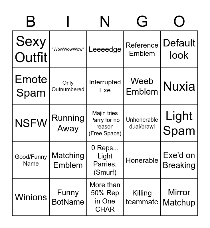 This bingo card has a free space and 25 words: Matching Emblem, More than 50% Rep in One CHAR, Interrupted Exe, Winions, Default look, Sexy Outfit, Emote Spam, "WowWowWow", Unhonerable dual/brawl, 0 Reps... Light Parries. (Smurf), Weeb Emblem, NSFW, Honerable, Exe'd on Breaking, Only Outnumbered, Rage Quit, Light Spam, Leeeedge, Nuxia, Running Away, Mirror Matchup, Funny BotName, Good/Funny Name, Reference Emblem and Killing teammate.