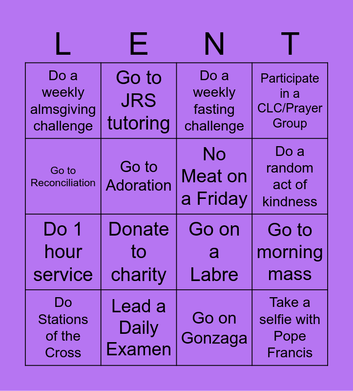 This bingo card has 16 words: Lead a Daily Examen, Go to morning mass, Do a weekly fasting challenge, Do a weekly almsgiving challenge, Do 1 hour service, Go to JRS tutoring, Go on a Labre, Go on Gonzaga, Go to Reconciliation, Go to Adoration, Do Stations of the Cross, Participate in a CLC/Prayer Group, Donate to charity, Do a random act of kindness, No Meat on a Friday and Take a selfie with Pope Francis.