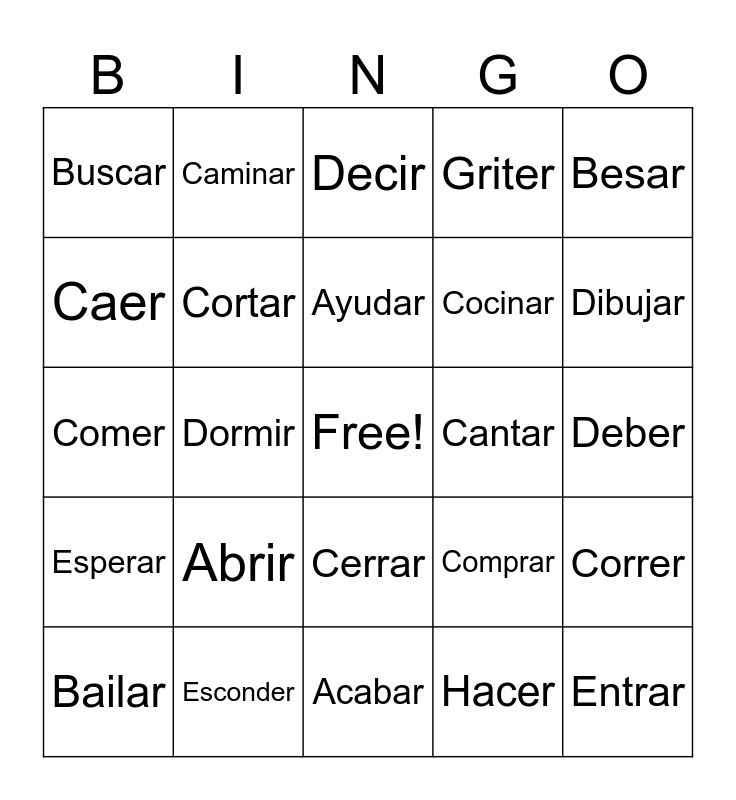 This bingo card has a free space and 25 words: Abrir, Acabar, Ayudar, Bailar, Besar, Buscar, Caer, Caminar, Cantar, Cerrar, Cocinar, Comer, Comprar, Correr, Cortar, Car, Deber, Decir, Dibujar, Dormir, Entrar, Esconder, Esperar, Griter and Hacer.