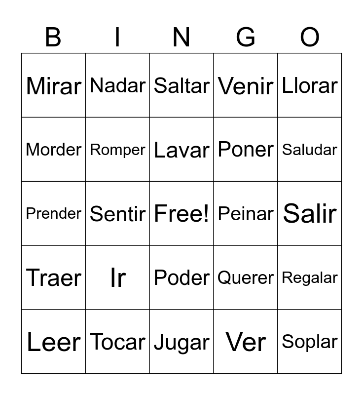 This bingo card has a free space and 25 words: Ir, Jugar, Lavar, Leer, Llorar, Mirar, Morder, Nadar, Peinar, Poder, Poner, Prender, Querer, Regalar, Romper, Saber, Salir, Saltar, Saludar, Sentir, Soplar, Tocar, Traer, Venir and Ver.