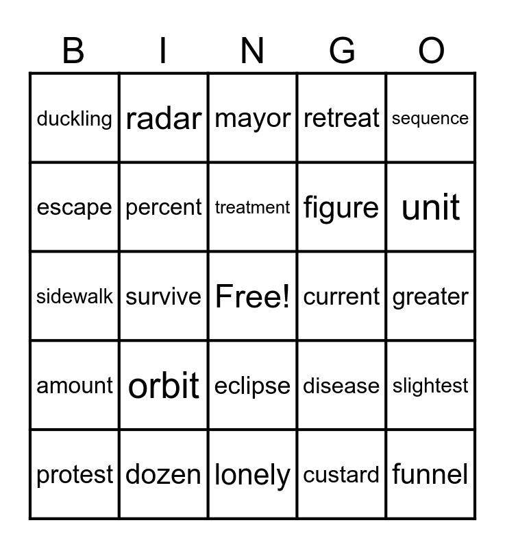 This bingo card has a free space and 29 words: protest, pavement, survive, trainer, duckling, mayor, percent, orbit, current, dozen, greater, funnel, lonely, custard, unit, minus, eclipse, amount, sequence, sidewalk, disease, central, figure, escape, retreat, radar, slightest, treatment and measure.