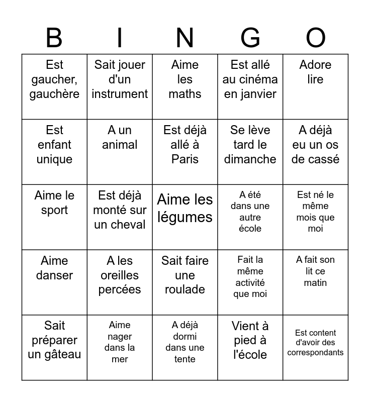 This bingo card has a free space and 24 words: A les oreilles percées, Aime nager dans la mer, Est déjà allé à Paris, Sait préparer un gâteau, Adore lire, Est gaucher, gauchère, Est enfant unique, Sait jouer d'un instrument, A été dans une autre école, Sait faire une roulade, Se lève tard le dimanche, Aime le sport, Fait la même activité que moi, A fait son lit ce matin, A un animal, Vient à pied à l'école, Est né le même mois que moi, Aime les maths, A déjà eu un os de cassé, Est déjà monté sur un cheval, Est content d'avoir des correspondants, Aime danser, Est allé au cinéma en janvier and A déjà dormi dans une tente.