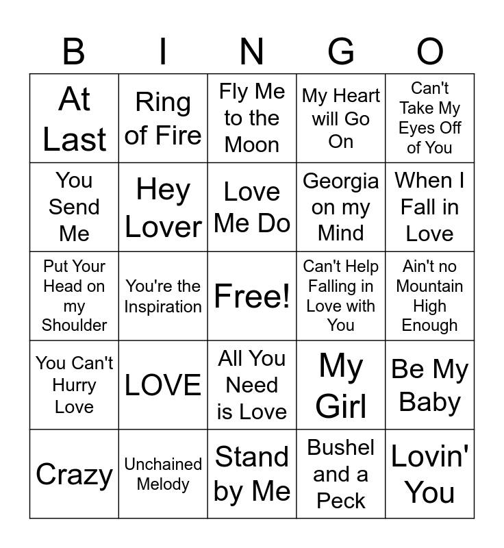 This bingo card has a free space and 44 words: I'm a Believer, Lovin' You, Tears on my Pillow, Crazy, Have I Told You Lately, Bushel and a Peck, Fly Me to the Moon, I Got You Babe, Can't Take My Eyes Off of You, Unchained Melody, My Heart will Go On, Can't Help Falling in Love with You, All You Need is Love, LOVE, I'll Be There, Stand by Me, Sugar Sugar, Put Your Head on my Shoulder, Brown Eyed Girl, When I Fall in Love, Ring of Fire, Sherry, Why do Fools Fall in Love?, At Last, Annie's Song, Ain't no Mountain High Enough, Chapel of Love, God Only Knows, My Girl, You Can't Hurry Love, That's Amore, Be My Baby, All I Have to do is Dream, Puppy Love, You're the Inspiration, Cheek to Cheek, Careless Whisper, Unforgettable, Love Me Do, You Send Me, Georgia on my Mind, Stupid Cupid, Hey Lover and Happy Together.
