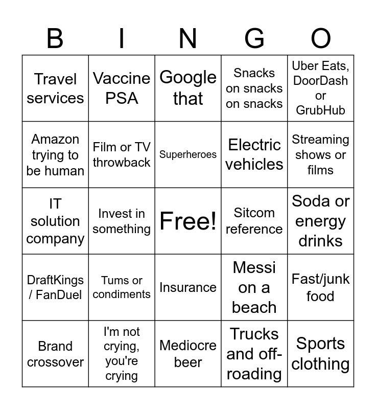 This bingo card has a free space and 27 words: Messi on a beach, A dog doing anything, Electric vehicles, Mediocre beer, Amazon trying to be human, Google that, Vaccine PSA, DraftKings / FanDuel, Sitcom reference, Fast/junk food, IT solution company, Snacks on snacks on snacks, Brand crossover, I'm not crying, you're crying, Streaming shows or films, Cell phone services, Film or TV throwback, Superheroes, Tums or condiments, Travel services, Soda or energy drinks, Trucks and off-roading, Invest in something, Sports clothing, Insurance, Uber Eats, DoorDash or GrubHub and Non football athletes.