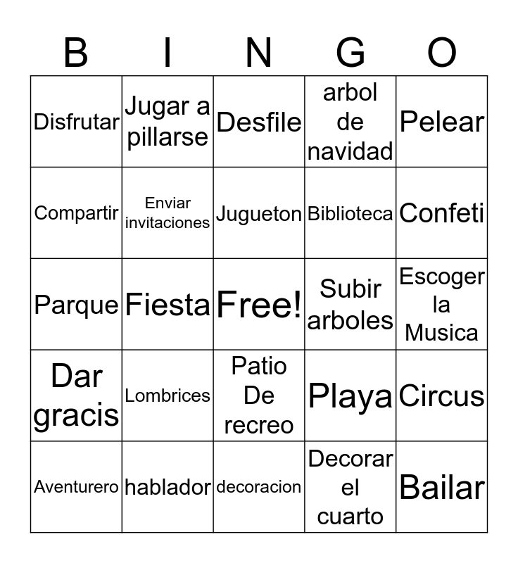 This bingo card has a free space and 24 words: Lombrices, hablador, Jugueton, Aventurero, Pelear, Disfrutar, Compartir, Jugar a pillarse, Subir arboles, Patio De recreo, Biblioteca, Parque, Playa, Circus, Enviar invitaciones, Decorar el cuarto, Escoger la Musica, Desfile, Confeti, Fiesta, Bailar, Dar gracis, arbol de navidad and decoracion.