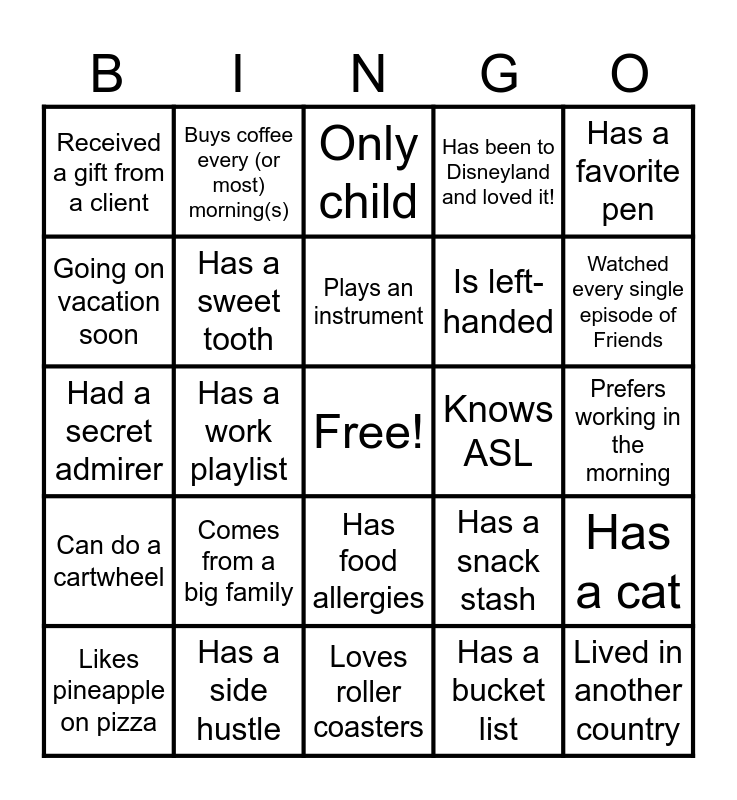 This bingo card has a free space and 44 words: Loves true crime podcasts, Lived in another country, Owns a boat, Likes pineapple on pizza, Uses a paper planner, Has a bucket list, Only child, Can do a cartwheel, Has a favorite pen, Has a side hustle, Has been to Disneyland and loved it!, Knows ASL, Has food allergies, Comes from a big family, Sends Holiday cards, Loves roller coasters, Has taken a cruise, Had a secret admirer, Practices a sport at least once a week, Watched every single episode of Friends, Buys coffee every (or most) morning(s), Met a celebrity, Won a contest, Received a gift from a client, Practices a sport at least once a week, Prefers working in the morning, Has worked here <1 year, Has a nickname, Has a snack stash, Can do a cartwheel, Gardens, Has a cat, Has a dog, Enjoys meeting new people, Has a work playlist, Has a tattoo, Has food allergies, Grew up in this city, Plays an instrument, Going on vacation soon, Is left-handed, Has an unusual hobby, Has a sweet tooth and Loves true crime podcasts, Lived in another country, Owns a boat, Likes pineapple on pizza, Uses a paper planner, Has a bucket list, Only child, Has a favorite pen, Has a side hustle, Has been to Disneyland and loved it!, Knows ASL, Has food all.