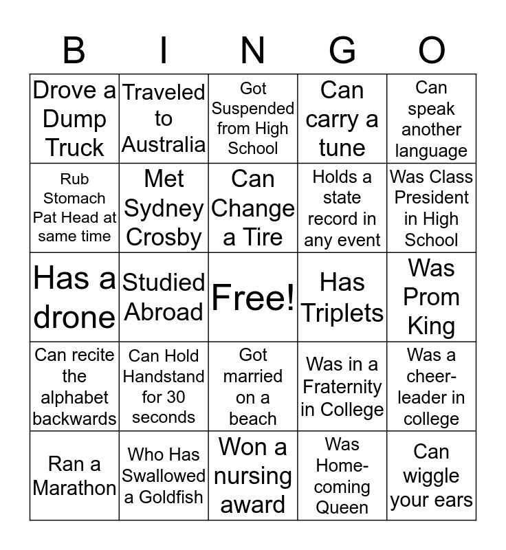 This bingo card has a free space and 24 words: Can Hold Handstand for 30 seconds, Who Has Swallowed a Goldfish, Can Change a Tire, Ran a Marathon, Can speak another language, Drove a Dump Truck, Rub Stomach Pat Head at same time, Traveled to Australia, Has Triplets, Got married on a beach, Holds a state record in any event, Has a drone, Was in a Fraternity in College, Was a cheer-leader in college, Met Sydney Crosby, Was Home-coming Queen, Was Prom King, Got Suspended from High School, Was Class President in High School, Studied Abroad, Can wiggle your ears, Can recite the alphabet backwards, Can carry a tune and Won a nursing award.