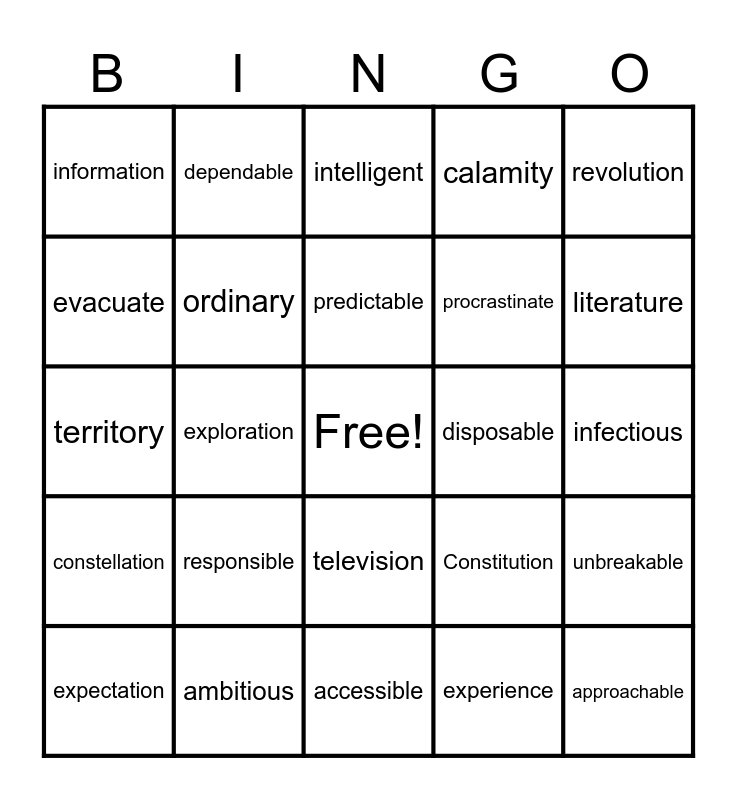 This bingo card has a free space and 29 words: expectation, unsuccessful, exploration, disappearance, information, intelligent, ordinary, responsible, disposable, ambitious, infectious, approachable, accessible, experience, literature, community, television, constellation, revolution, territory, Constitution, admiration, procrastinate, evacuate, calamity, dependable, unbreakable, predictable and insulation.