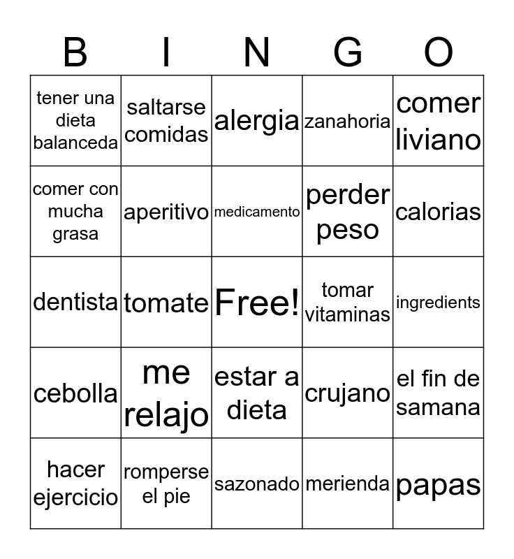 This bingo card has a free space and 24 words: me relajo, romperse el pie, medicamento, hacer ejercicio, comer liviano, tener una dieta balanceda, comer con mucha grasa, saltarse comidas, tomar vitaminas, estar a dieta, perder peso, dentista, crujano, el fin de samana, aperitivo, merienda, ingredients, alergia, calorias, tomate, papas, cebolla, zanahoria and sazonado.