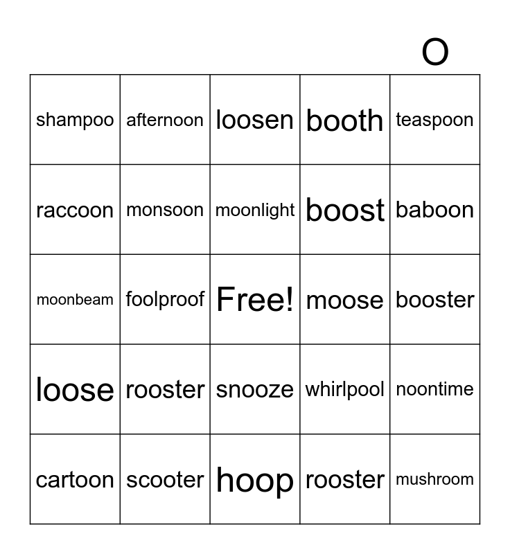 This bingo card has a free space and 24 words: rooster, scooter, moonlight, cartoon, teaspoon, shampoo, raccoon, afternoon, moose, snooze, boost, moonbeam, whirlpool, noontime, monsoon, rooster, booster, loosen, baboon, foolproof, mushroom, loose, booth and hoop.