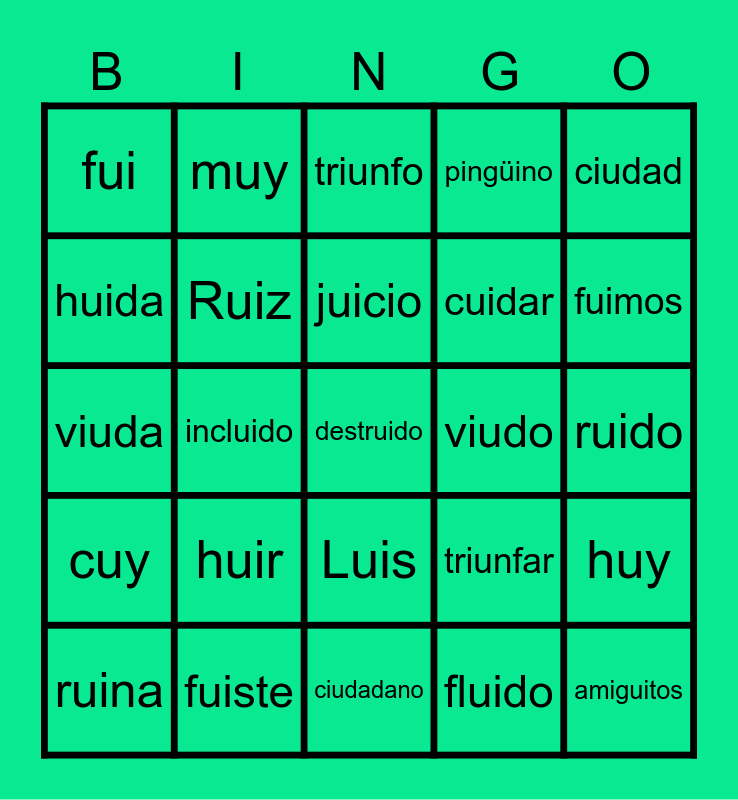 This bingo card has a free space and 24 words: huir, fuiste, juicio, ruina, ciudad, fui, huida, muy, viudo, Luis, cuidar, viuda, triunfar, huy, Ruiz, fluido, ruido, triunfo, fuimos, incluido, amiguitos, cuy, pingüino and ciudadano.