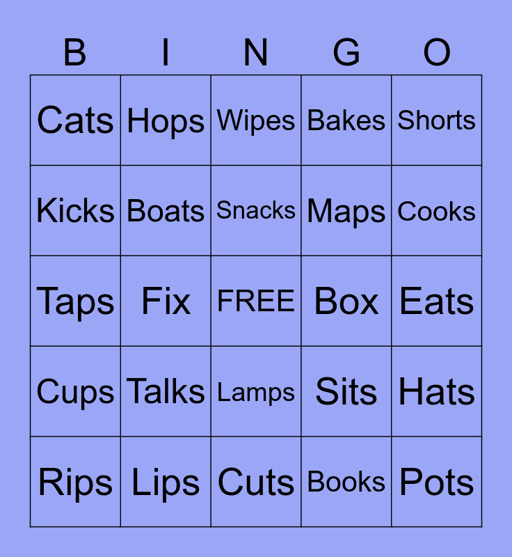This bingo card has a free space and 24 words: Talks, Lips, Snacks, Rips, Shorts, Cats, Kicks, Hops, Box, Lamps, Maps, Taps, Sits, Hats, Boats, Books, Eats, Wipes, Cooks, Fix, Pots, Cups, Bakes and Cuts.