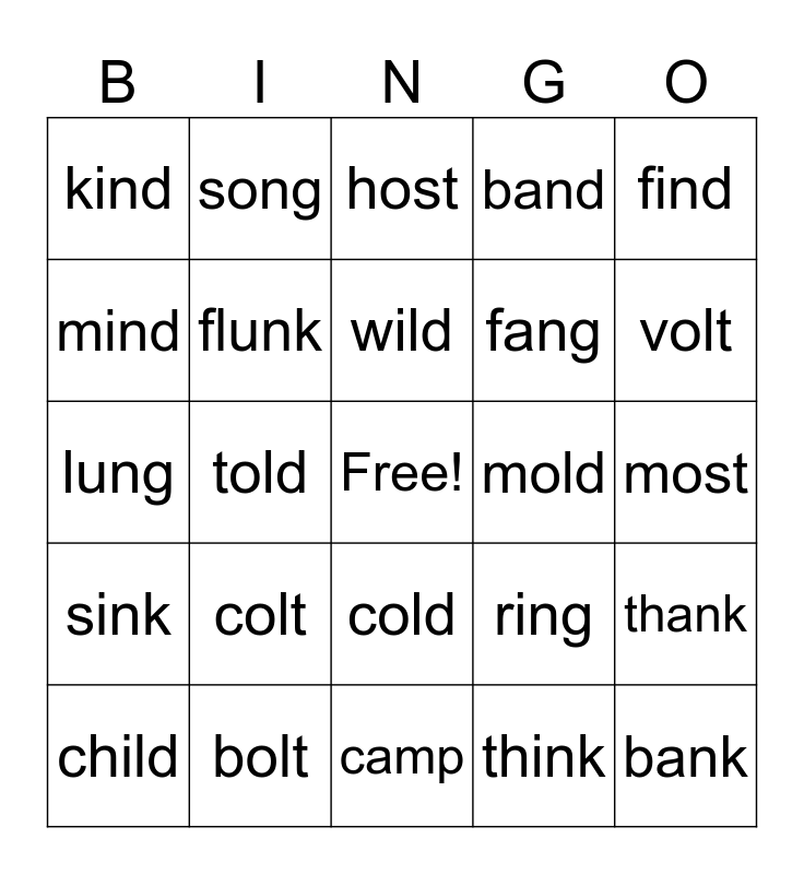 This bingo card has a free space and 24 words: colt, bolt, wild, child, find, kind, mind, song, mold, cold, fang, lung, ring, thank, flunk, think, most, host, volt, told, bank, sink, band and camp.