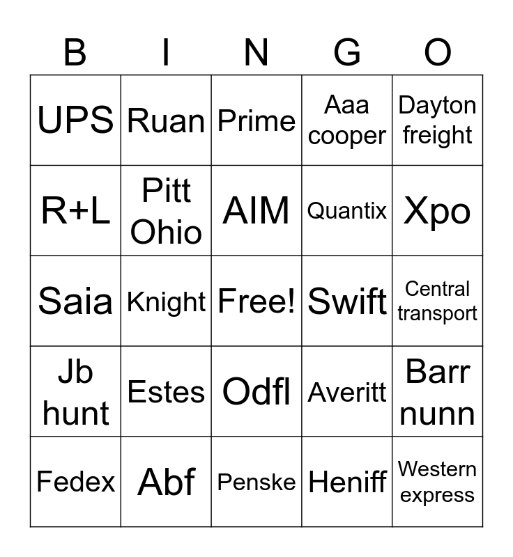 This bingo card has a free space and 24 words: Estes, Abf, AIM, Fedex, Dayton freight, UPS, R+L, Ruan, Swift, Odfl, Quantix, Saia, Averitt, Barr nunn, Pitt Ohio, Heniff, Central transport, Prime, Xpo, Knight, Western express, Jb hunt, Aaa cooper and Penske.