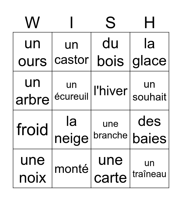 This bingo card has 18 words: la neige, un traîneau, du bois, un ours, une branche, la glace, une noix, un castor, un souhait, froid, une carte, un arbre, des baies, un écureuil, l'hiver, une boussole, monté and un renard.