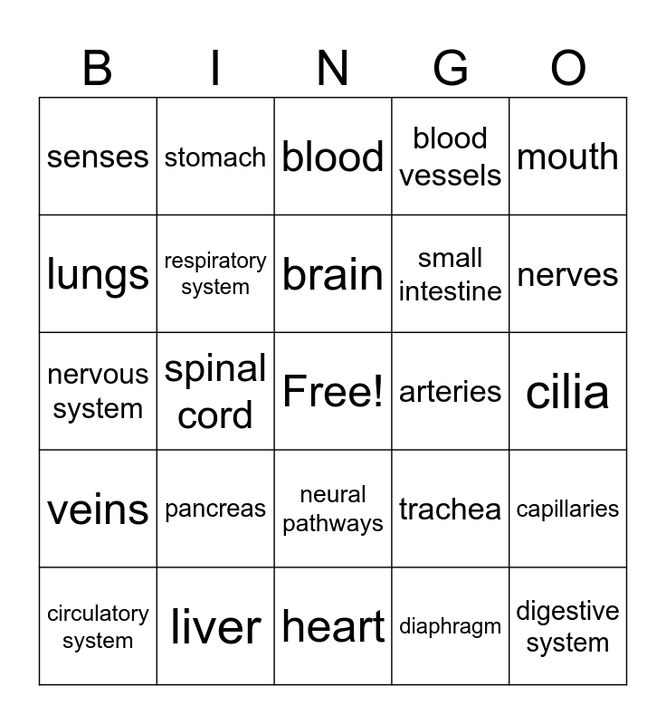 This bingo card has a free space and 24 words: circulatory system, pancreas, brain, diaphragm, mouth, senses, stomach, blood, arteries, cilia, nervous system, respiratory system, trachea, capillaries, lungs, liver, heart, blood vessels, nerves, veins, spinal cord, neural pathways, small intestine and digestive system.