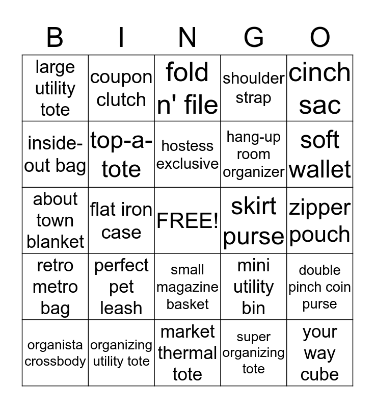 This bingo card has a free space and 24 words: perfect pet leash, organizing utility tote, hostess exclusive, organista crossbody, cinch sac, large utility tote, inside-out bag, coupon clutch, skirt purse, small magazine basket, hang-up room organizer, about town blanket, mini utility bin, double pinch coin purse, top-a-tote, super organizing tote, zipper pouch, fold n' file, soft wallet, flat iron case, your way cube, retro metro bag, shoulder strap and market thermal tote.
