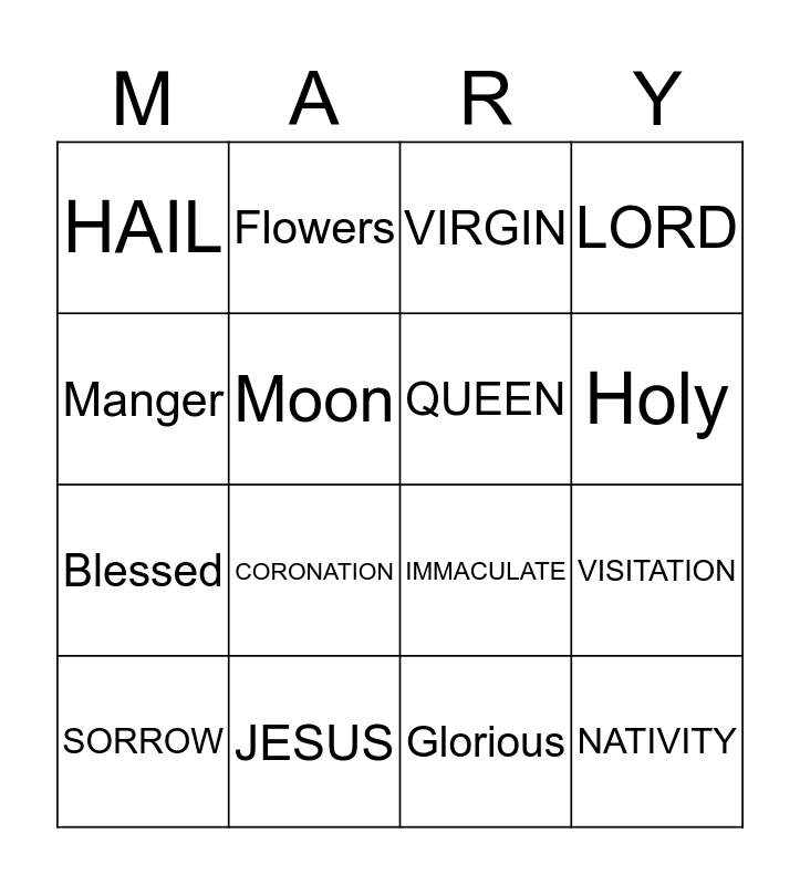 This bingo card has 27 words: ROSARY, LOVE, Blessed, Hope, Moon, VIRGIN, Flowers, NATIVITY, JESUS, MOTHER, IMMACULATE, LORD, Joseph, miracles, CORONATION, Miraculous, QUEEN, Holy, CROWN, HAIL, Glorious, Joyful, VISITATION, SORROW, PURITY, Manger and Stable.