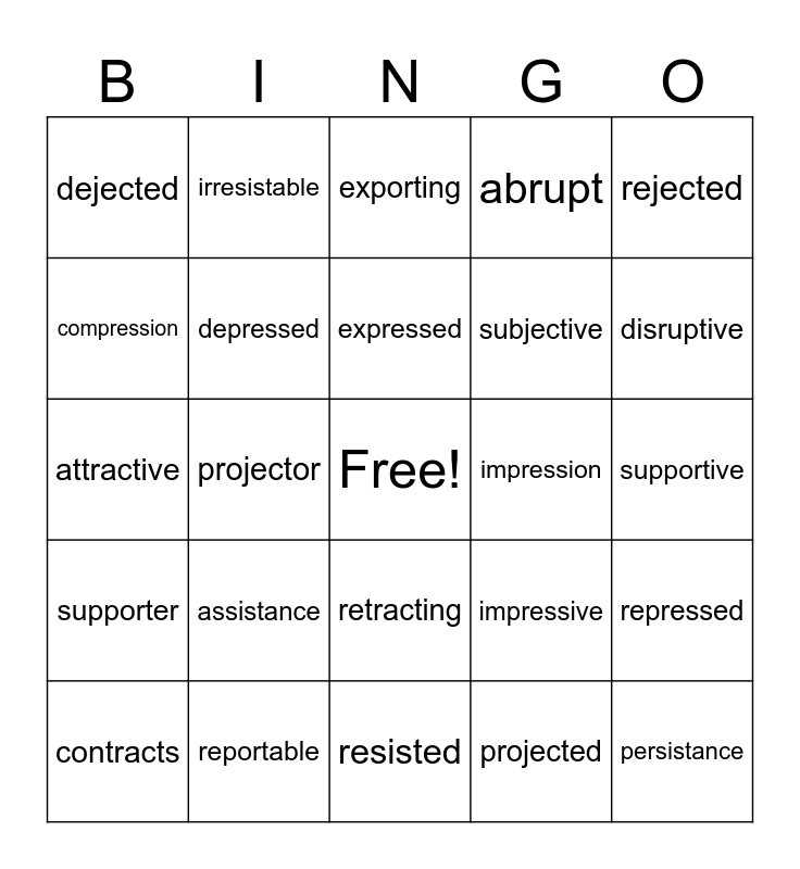 This bingo card has a free space and 52 words: assisting, persistance, resistable, resisted, assistance, resistance, irresistable, pressure, compression, compressor, depressed, depression, repressed, impressive, oppression, expression, expressed, impression, injection, rejected, projector, projected, dejected, subjective, subjects, objective, ejected, corruption, disruptive, erupted, erupting, abrupt, interrupt, important, importance, exporting, reportable, reporter, portable, transportation, transporting, supportive, supporter, contracted, retracting, retractable, tractor, attractive, attract, distract, contracts and contractor.