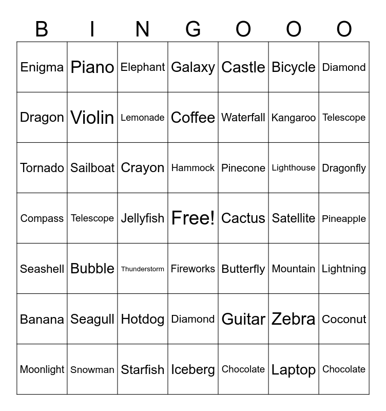 This bingo card has a free space and 75 words: Apple, Banana, Elephant, Guitar, Sunshine, Pillow, Mountain, Laptop, Butterfly, Ocean, Chocolate, Telescope, Dragon, Bicycle, Universe, Waterfall, Pineapple, Kangaroo, Rainbow, Castle, Fireworks, Coffee, Diamond, Piano, Galaxy, Iceberg, Moonlight, Starfish, Balloon, Butterfly, Thunderstorm, Backpack, Adventure, Pinecone, Lemonade, Violin, Watermelon, Robot, Tornado, Jellyfish, Diamond, Hotdog, Laptop, Autumn, Snowflake, Cactus, Dragonfly, Enigma, Marshmallow, Pencil, Satellite, Hammock, Umbrella, Lightning, Chocolate, Giraffe, Seashell, Zebra, Satellite, Coconut, Crayon, Origami, Bumblebee, Rainbow, Seagull, Telescope, Bubble, Bamboo, Snowman, Lighthouse, Sailboat, Compass, Galaxy, Telescope and Waterfall.
