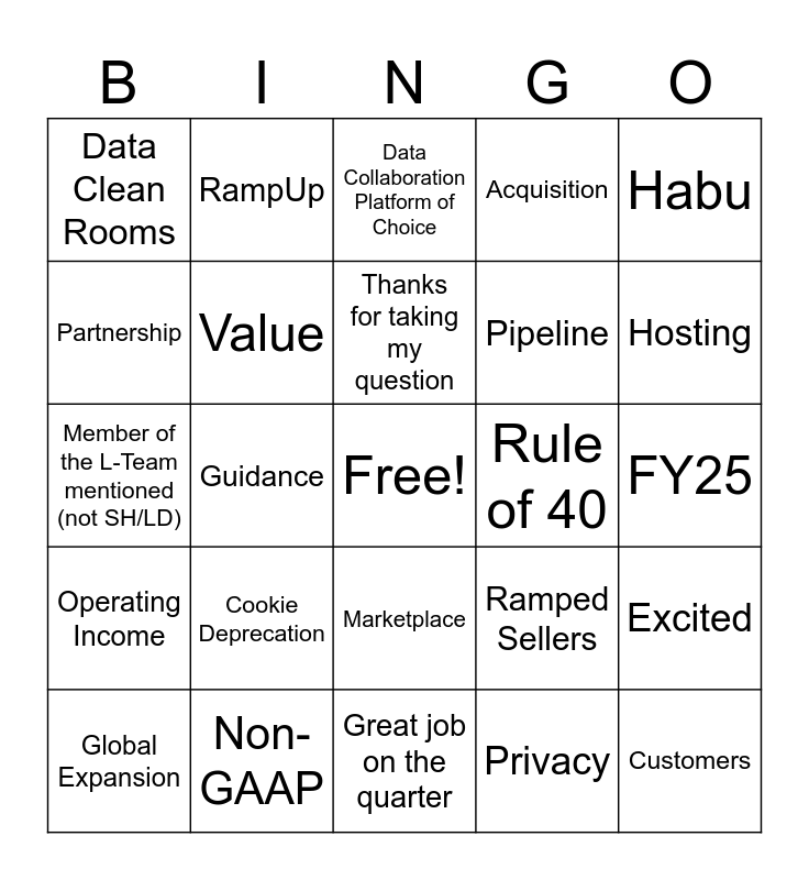 This bingo card has a free space and 24 words: Cookie Deprecation, Non-GAAP, Thanks for taking my question, Global Expansion, Habu, Data Clean Rooms, Partnership, RampUp, Rule of 40, Marketplace, Pipeline, Member of the L-Team mentioned (not SH/LD), Ramped Sellers, Excited, Value, Privacy, FY25, Data Collaboration Platform of Choice, Hosting, Guidance, Customers, Operating Income, Acquisition and Great job on the quarter.
