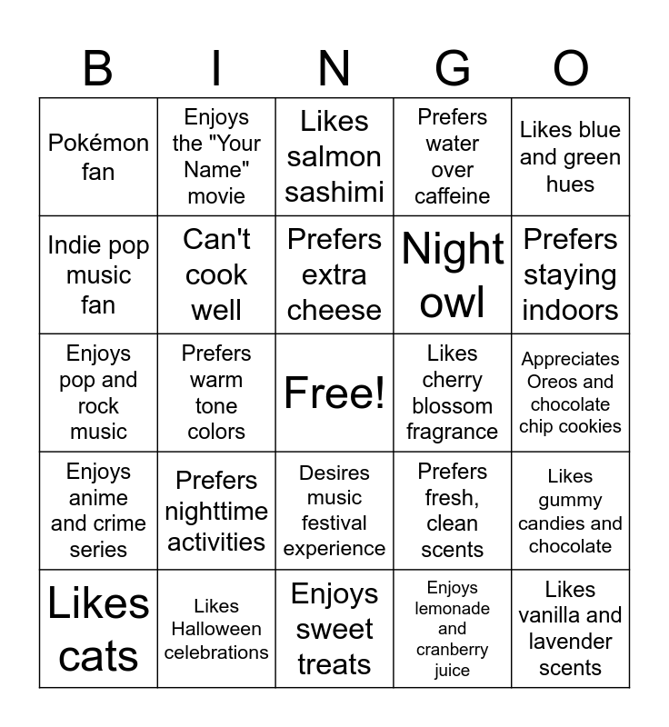 This bingo card has a free space and 55 words: Likes to dance, Likes cats, Enjoys baths, Pokémon fan, Enjoys sweet treats, Vegetarian, Can't cook well, Prefers planned activities, Night owl, Enjoys staying in, Prefers water over caffeine, Enjoys coffee and tea, Appreciates birds, Enjoys Asian cuisine, Likes blue, red, or green, Enjoys darker colors, Likes blue and green hues, Prefers warm tone colors, Casual dressing style, Likes vanilla and lavender scents, Likes cherry blossom fragrance, Enjoys honey and citrus scents, Prefers fresh, clean scents, Likes salmon sashimi, Enjoys pasta dishes, Prefers extra cheese, Enjoys lemonade and cranberry juice, Enjoys sweet popcorn, Appreciates Oreos and chocolate chip cookies, Likes gummy candies and chocolate, Prefers white chocolate and milk chocolate, Enjoys brownies and cheesecake, Likes sugar cookies and pretzels, Enjoys strawberry croissants, Indie pop music fan, Enjoys pop and rock music, Appreciates K-pop and J-pop, Enjoys anime and crime series, Enjoys animated and horror movies, Likes Ghibli Studio and Disney films, Enjoys the "Your Name" movie, Enjoys Christmas festivities, Enjoys swimming and tennis, Appreciates their computer and bed, Prefers nighttime activities, Likes Halloween celebrations, Enjoys videogames and drawing, Appreciates nighttime, Enjoys afternoon and nighttime, Prefers staying indoors, Values written communication, Values education and good food, Values friendships and gaming, Desires music festival experience and Desires Japan visit.