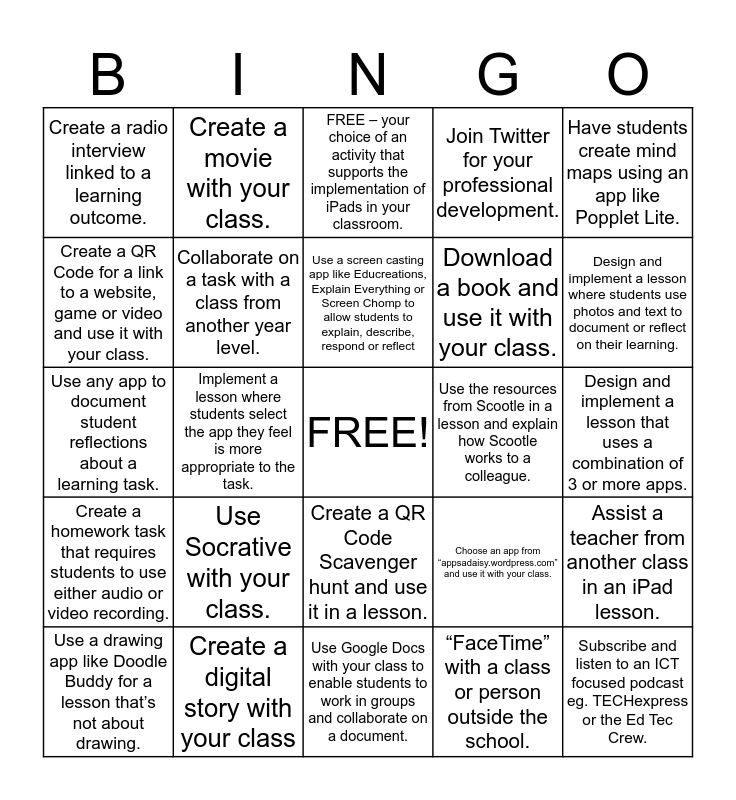 This bingo card has a free space and 24 words: Use Socrative with your class., Create a digital story with your class, Use a screen casting app like Educreations, Explain Everything or Screen Chomp to allow students to explain, describe, respond or reflect, Use a drawing app like Doodle Buddy for a lesson that’s not about drawing., Have students create mind maps using an app like Popplet Lite., Create a radio interview linked to a learning outcome., Create a QR Code for a link to a website, game or video and use it with your class., Create a movie with your class., Use the resources from Scootle in a lesson and explain how Scootle works to a colleague., Create a QR Code Scavenger hunt and use it in a lesson., Download a book and use it with your class., Use any app to document student reflections about a learning task., Choose an app from “appsadaisy.wordpress.com” and use it with your class., Assist a teacher from another class in an iPad lesson., Collaborate on a task with a class from another year level., “FaceTime” with a class or person outside the school., Design and implement a lesson that uses a combination of 3 or more apps., FREE – your choice of an activity that supports the implementation of iPads in your classroom., Design and implement a lesson where students use photos and text to document or reflect on their learning., Implement a lesson where students select the app they feel is more appropriate to the task., Subscribe and listen to an ICT focused podcast eg. TECHexpress or the Ed Tec Crew., Create a homework task that requires students to use either audio or video recording., Join Twitter for your professional development. and Use Google Docs with your class to enable students to work in groups and collaborate on a document..