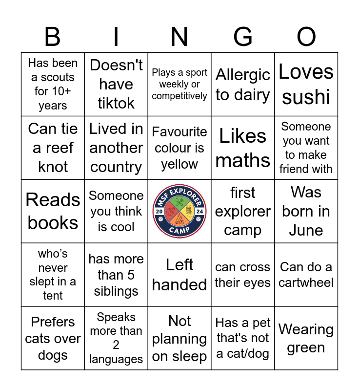 This bingo card has a free space and 24 words: has more than 5 siblings, Speaks more than 2 languages, Favourite colour is yellow, Prefers cats over dogs, Loves sushi, Has been a scouts for 10+ years, Can tie a reef knot, Doesn't have tiktok, first explorer camp, Left handed, Likes maths, Reads books, can cross their eyes, Can do a cartwheel, Lived in another country, Has a pet that's not a cat/dog, Was born in June, Plays a sport weekly or competitively, Someone you want to make friend with, Someone you think is cool, Wearing green, who’s never slept in a tent, Allergic to dairy and Not planning on sleep.