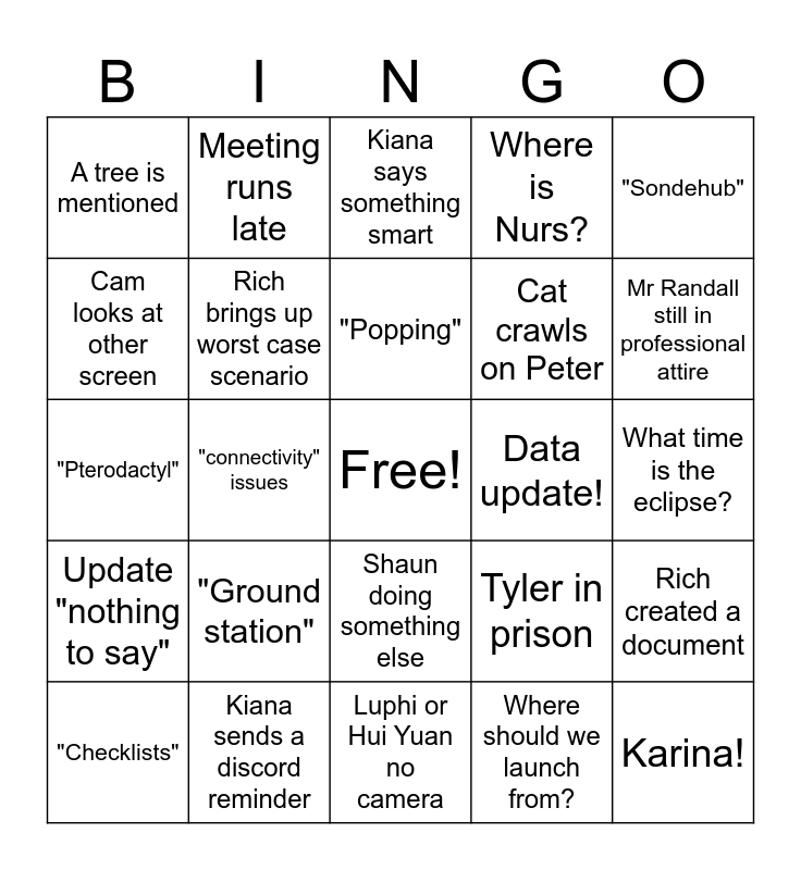 This bingo card has a free space and 27 words: Tyler in prison, SCH member is late, Cat crawls on Peter, Luphi or Hui Yuan no camera, Cam looks at other screen, Kiana says something smart, Meeting runs late, Update "nothing to say", Data update!, Rich created a document, "Pterodactyl", Where is Nurs?, "Checklists", Kiana sends a discord reminder, Mr Randall still in professional attire, Sperling is in trash human-wear, Rich brings up worst case scenario, "Popping", "Ground station", A tree is mentioned, What time is the eclipse?, Where should we launch from?, "connectivity" issues, Karina!, Shaun doing something else, "Sondehub" and A parachute is mentioned.