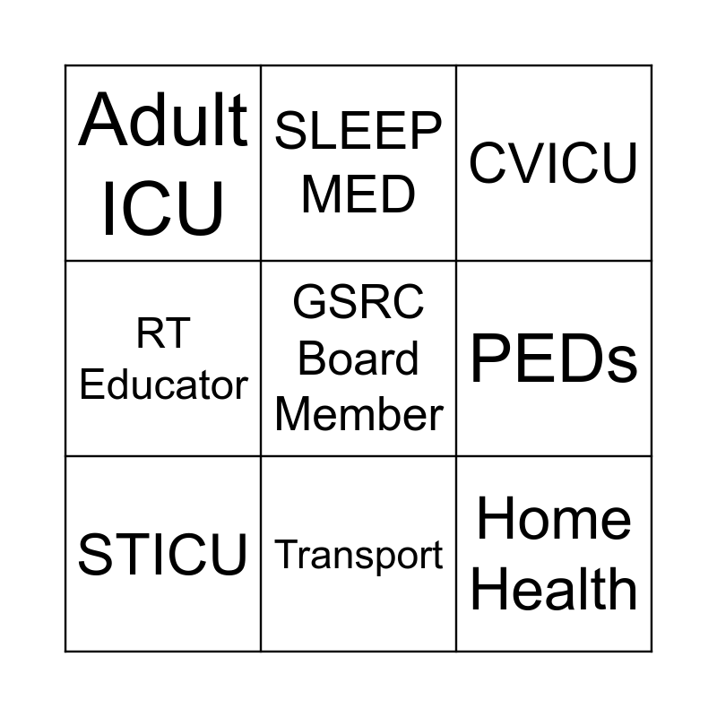 This bingo card has a free space and 23 words: PFT, Med Surge, Transport, Chair of RT Dept., Home Health, Adult ICU, PEDs, SLEEP MED, ER, Director of RT, Industry Rep, NICU, PICC Team, PICU, Endoscopy, Management, CVICU, Neuro ICU, STICU, Transplant, RT Educator, Pt Coordinator and ECMO.