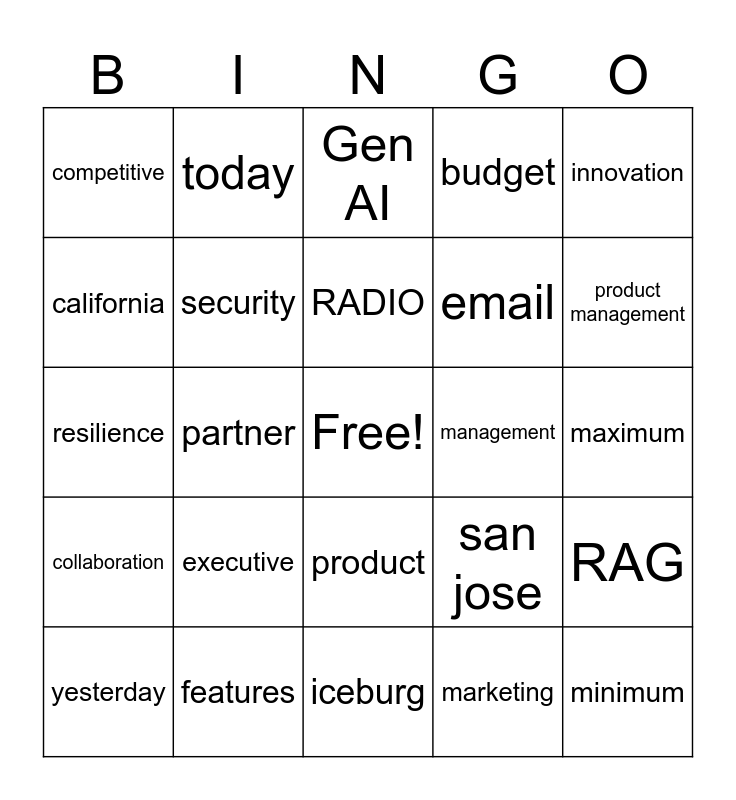 This bingo card has a free space and 41 words: data, resilience, customer, security, features, product, RADIO, metrics, innovation, collaboration, partner, budget, minimum, maximum, management, executive, winning, competitive, industry, Gen AI, RAG, scalable, iceburg, email, sales, support, marketing, legal, product management, engineering, tomorrow, today, yesterday, historical, san jose, california, HQ, challenges, quota, proposal and search.
