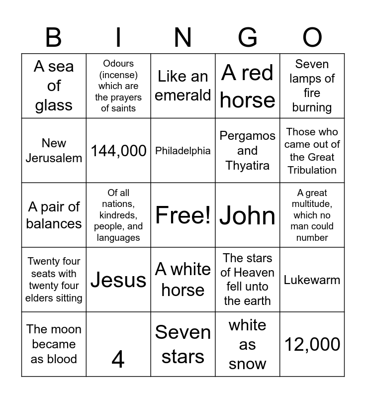 This bingo card has a free space and 24 words: Jesus, 4, Philadelphia, The moon became as blood, Seven lamps of fire burning, A sea of glass, New Jerusalem, Odours (incense) which are the prayers of saints, John, A white horse, Pergamos and Thyatira, A pair of balances, The stars of Heaven fell unto the earth, Lukewarm, 144,000, white as snow, A great multitude, which no man could number, Like an emerald, Those who came out of the Great Tribulation, Of all nations, kindreds, people, and languages, 12,000, Twenty four seats with twenty four elders sitting, A red horse and Seven stars.