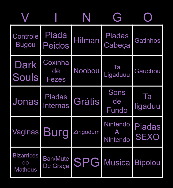 This bingo card has a free space and 24 words: Burg, Ban/Mute De Graça, Noobou, Bizarrices do Matheus, Gatinhos, Controle Bugou, Dark Souls, Piada Peidos, Sons de Fundo, Zirigodum, Ta Ligaduuu, Jonas, Nintendo A Nintendo, Piadas SEXO, Coxinha de Fezes, Musica, Ta ligaduu, Hitman, Gauchou, Piadas Internas, Bipolou, Vaginas, Piadas Cabeça and SPG.