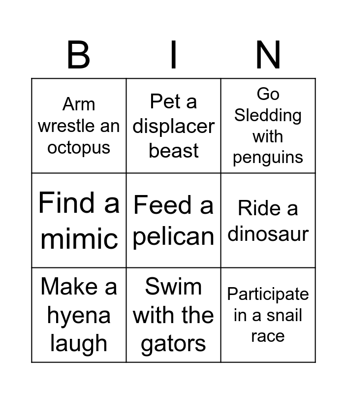 This bingo card has 9 words: Make a hyena laugh, Go Sledding with penguins, Pet a displacer beast, Find a mimic, Arm wrestle an octopus, Ride a dinosaur, Feed a pelican, Participate in a snail race and Swim with the gators.