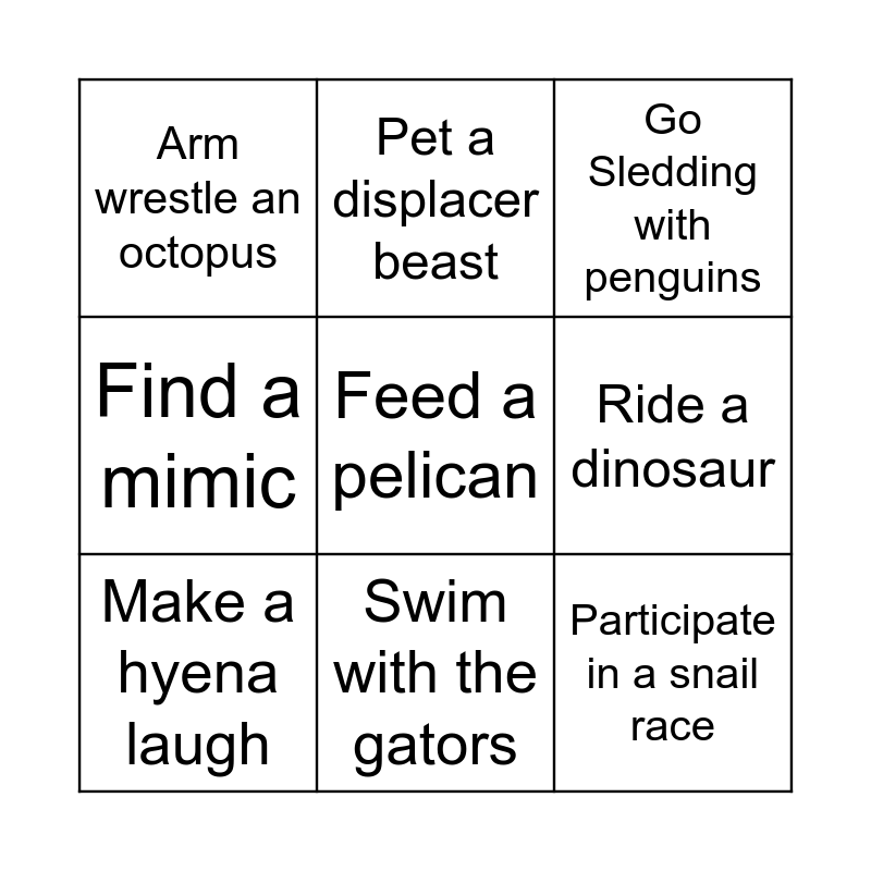 This bingo card has 9 words: Make a hyena laugh, Go Sledding with penguins, Pet a displacer beast, Find a mimic, Arm wrestle an octopus, Ride a dinosaur, Feed a pelican, Participate in a snail race and Swim with the gators.
