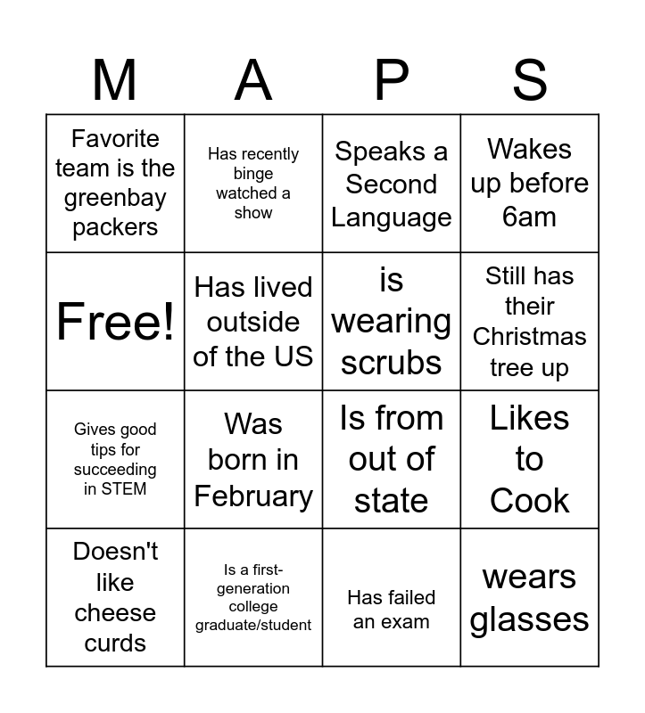 This bingo card has 16 words: Is a first-generation college graduate/student, Likes to Cook, Speaks a Second Language, Favorite team is the greenbay packers, Gives good tips for succeeding in STEM, Has recently binge watched a show, Is from out of state, Has failed an exam, Free!, Has lived outside of the US, Doesn't like cheese curds, Wakes up before 6am, Was born in February, Still has their Christmas tree up, is wearing scrubs and wears glasses.