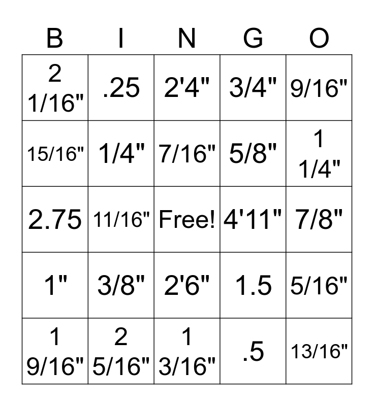 This bingo card has a free space and 38 words: 1/16", 1/8", 3/16", 1/4", 5/16", 3/8", 7/16", 1/2", 9/16", 5/8", 11/16", 3/4", 13/16", 7/8", 15/16", 1", 3'6", 2'4", 1'15/16", 4'11", 2 1/16", 2 5/16", 1 1/4", 1 9/16", 2 1/8", 1 3/16", 48", 96", 16", 72", 6'6 3/4", 2'6", .5, .25, .75, 1.5, 2.75 and 3.25.