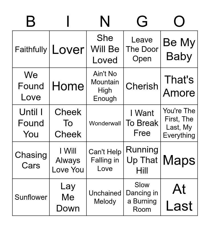 This bingo card has a free space and 46 words: I Want To Hold Your Hand, At Last, My Girl, Unchained Melody, I Will Always Love You, I Want to Know What Love Is, Lover, Let's Stay Together, We Found Love, Time After Time, Home, Leave The Door Open, Maps, Running Up That Hill, Vision of Love, Easy, Ain't No Mountain High Enough, I Want To Break Free, Signed, Sealed, Delivered, Be My Baby, Cheek To Cheek, Slow Dancing in a Burning Room, Faithfully, Cherish, I'm Gonna Be (500 Miles), That's Amore, Sunflower, Tennessee Whiskey, Can't Help Falling in Love, Chasing Cars, Iris, You Are So Beautiful, Every Breath You Take, Fast Car, You're Still The One, Lay Me Down, You're The First, The Last, My Everything, Crash into Me, She's Always a Woman, Earth Angel, Grow as We Go, She Will Be Loved, Until I Found You, Love Song, Sweet Disposition and The Reason.