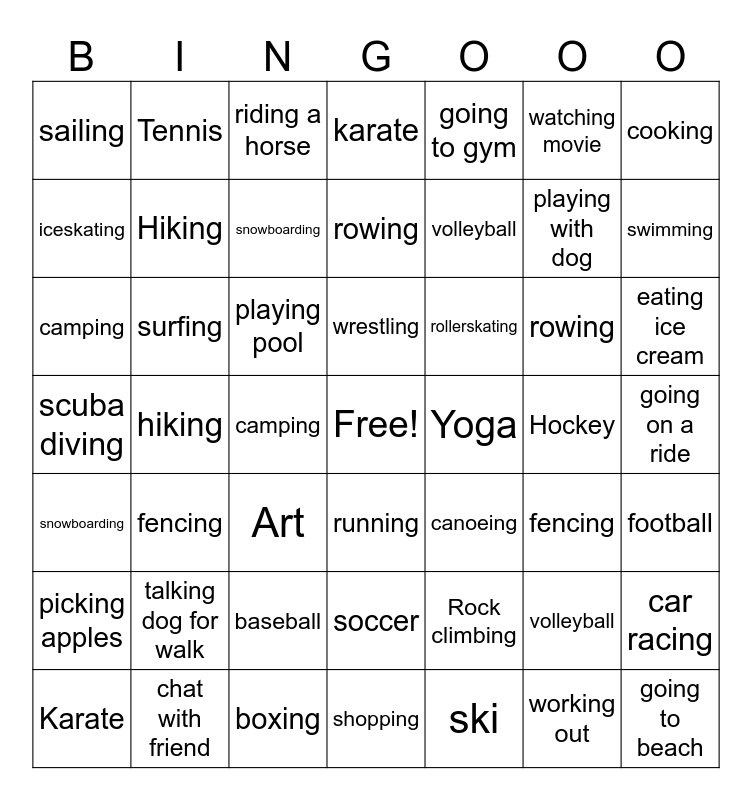 This bingo card has a free space and 48 words: Rock climbing, playing with dog, shopping, hiking, playing pool, going on a ride, Tennis, chat with friend, watching movie, running, cooking, karate, rowing, rollerskating, picking apples, Hockey, iceskating, swimming, volleyball, going to gym, volleyball, camping, sailing, Hiking, car racing, snowboarding, eating ice cream, Karate, wrestling, surfing, working out, Yoga, football, talking dog for walk, scuba diving, canoeing, fencing, camping, Art, baseball, snowboarding, going to beach, riding a horse, boxing, rowing, soccer, fencing and ski.