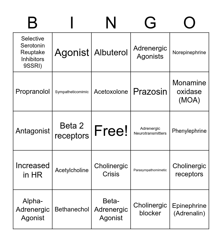 This bingo card has a free space and 36 words: Autonomic Nervous System, Sympathetic Nervous System, Parasympathetic Nervous System, Sympatheticomimic, Parasympathomimetic, Increased in HR, Acetoxolone, Does not affect blood glucose, Norepinephrine, Neurotransmitters, Beta 2 receptors, Adrenergic Agonists, Adrenergic Receptors, Adrenergic Neurotransmitters, Monamine oxidase (MOA), Selective Serotonin Reuptake Inhibitors 9SSRI), Adrenergic Antagonists, Acetylcholine, Epinephrine (Adrenalin), Albuterol, Phenylephrine, Cholinergic receptors, Bethanechol, Alpha-Adrenergic Agonist, Beta-Adrenergic Agonist, Agonist, Antagonist, Adrenergic Antagonists/Adrenergic Blocker, Prazosin, Propranolol, Atropine, Nonselective adrenergic agonist, Cholinergic blocker, Cholinergic Crisis, Adrenergic Neurotransmitters and Adrenergic blocker.