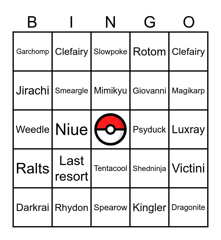 This bingo card has a free space and 30 words: Rhydon, Ruby, Niue, Foxfire, Garchomp, Slowpoke, Smeargle, Tentacool, Psyduck, Spearow, Luxray, Dragonite, Kingler, Golem, Magikarp, Spoink, Shedninja, Ralts, Last resort, Clefairy, Weedle, Magikarp, Clefairy, Giovanni, Jirachi, Rotom, Victini, Darkrai, Mimikyu and Ditto.