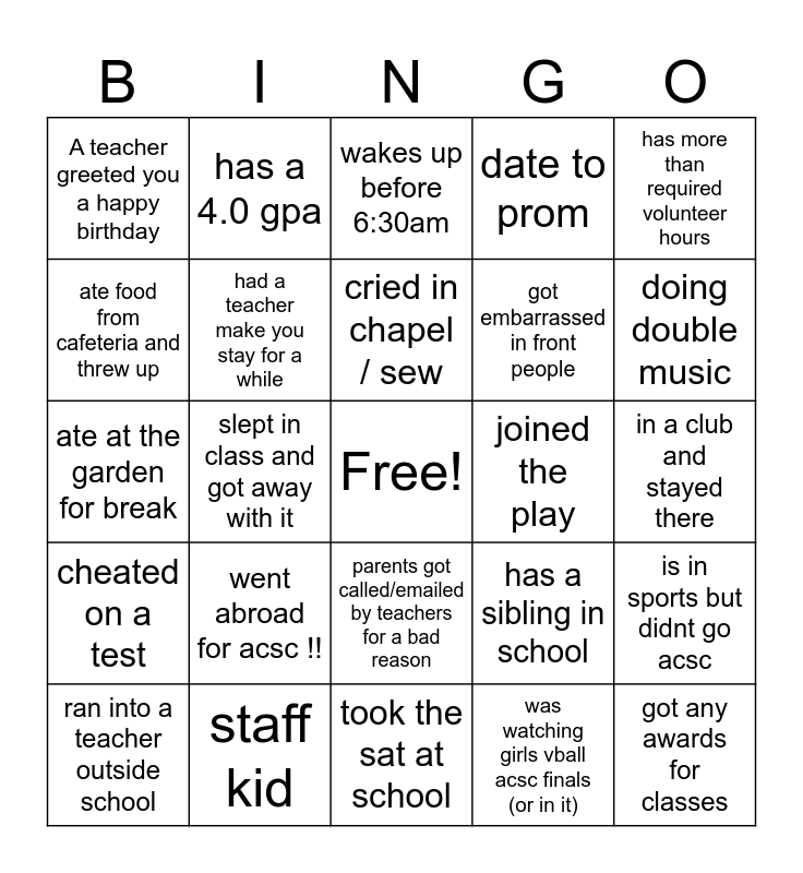 This bingo card has a free space and 24 words: went abroad for acsc !!, staff kid, cried in chapel / sew, ran into a teacher outside school, has more than required volunteer hours, A teacher greeted you a happy birthday, ate food from cafeteria and threw up, has a 4.0 gpa, joined the play, parents got called/emailed by teachers for a bad reason, got embarrassed in front people, ate at the garden for break, has a sibling in school, is in sports but didnt go acsc, had a teacher make you stay for a while, was watching girls vball acsc finals (or in it), in a club and stayed there, wakes up before 6:30am, doing double music, slept in class and got away with it, got any awards for classes, cheated on a test, date to prom and took the sat at school.