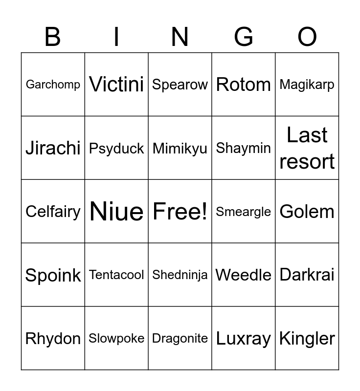 This bingo card has a free space and 29 words: Rhydon, Ruby, Niue, Foxfire, Garchomp, Spearow, Psyduck, Tentacool, Smeargle, Slowpoke, Golem, Kingler, Dragonite, Luxray, Last resort, Ralts, Shedninja, Spoink, Magikarp, Celfairy, Weedle, Mysteries of the Earth, Shaymin, Jirachi, Rotom, Victini, Darkrai, Mimikyu and Ditto.