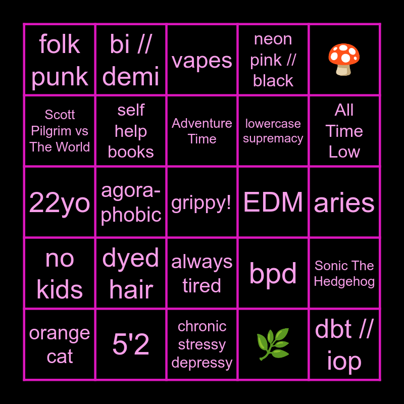 This bingo card has a free space and 24 words: dyed hair, 5'2, Adventure Time, orange cat, 🍄, folk punk, Scott Pilgrim vs The World, bi // demi, EDM, always tired, lowercase supremacy, 22yo, bpd, Sonic The Hedgehog, self help books, 🌿, aries, vapes, All Time Low, agora-phobic, dbt // iop, no kids, neon pink // black and chronic stressy depressy.