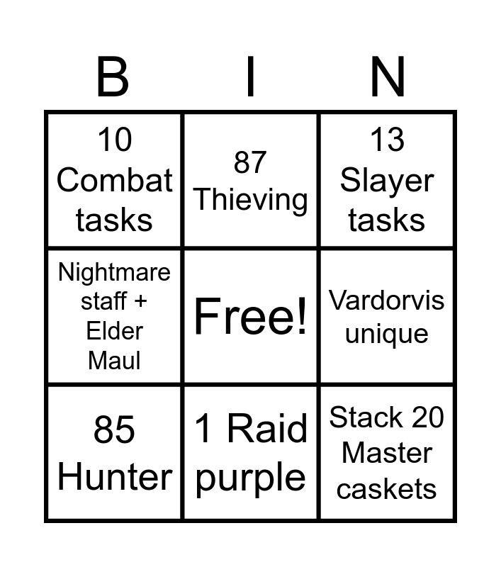 This bingo card has a free space and 8 words: Vardorvis unique, 13 Slayer tasks, 87 Thieving, 85 Hunter, 10 Combat tasks, Stack 20 Master caskets, Nightmare staff + Elder Maul and 1 Raid purple.