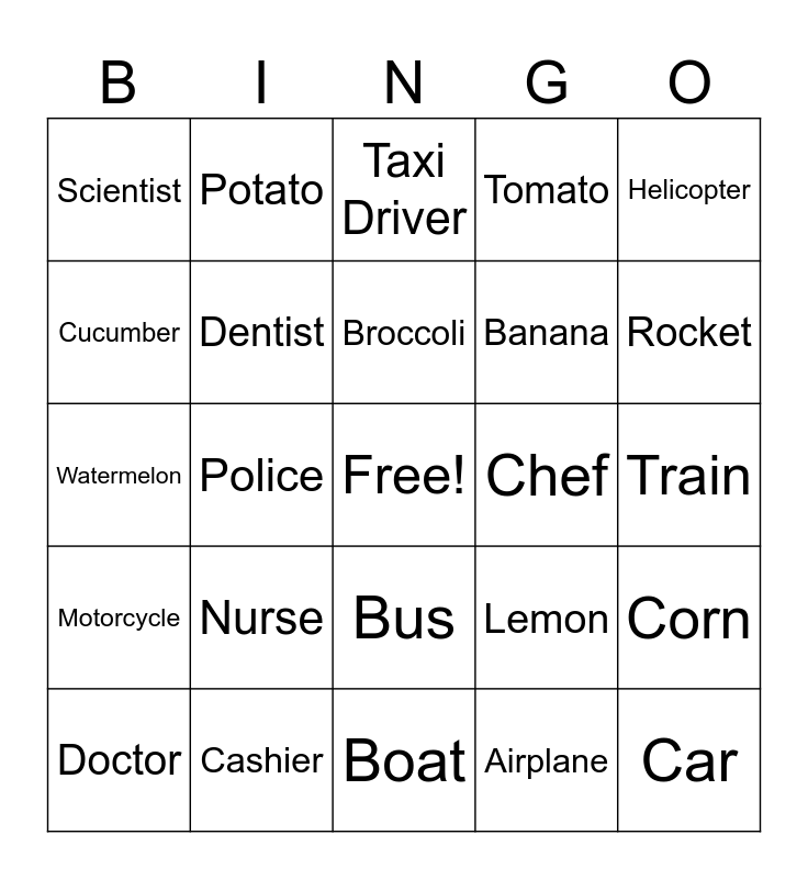 This bingo card has a free space and 29 words: Doctor, Firefighter, Police, Teacher, Scientist, Taxi Driver, Dentist, Nurse, Chef, Cashier, Train, Car, Boat, Airplane, Rocket, Truck, Bus, Motorcycle, Helicopter, Watermelon, Lemon, Orange, Banana, Cucumber, Tomato, Potato, Corn, Broccoli and Pumpkin.