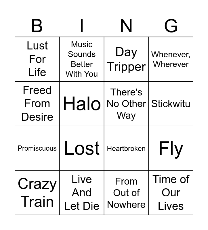 This bingo card has 30 words: Fly Away, Can't Stop, Fly, Mr. Brightside, Lust For Life, Day Tripper, There's No Other Way, Supersonic, Live And Let Die, Have A Nice Day, From Out of Nowhere, Crazy Train, Ace of Spades, Bring Me To Life, Lost, Between Angels And Insects, Alive, Time of Our Lives, Low, Freed From Desire, Heartbroken, Return of the Mack, Music Sounds Better With You, Promiscuous, Halo, Whenever, Wherever, Bleeding Love, Can't Get You out of My Head, Stickwitu and Crazy.